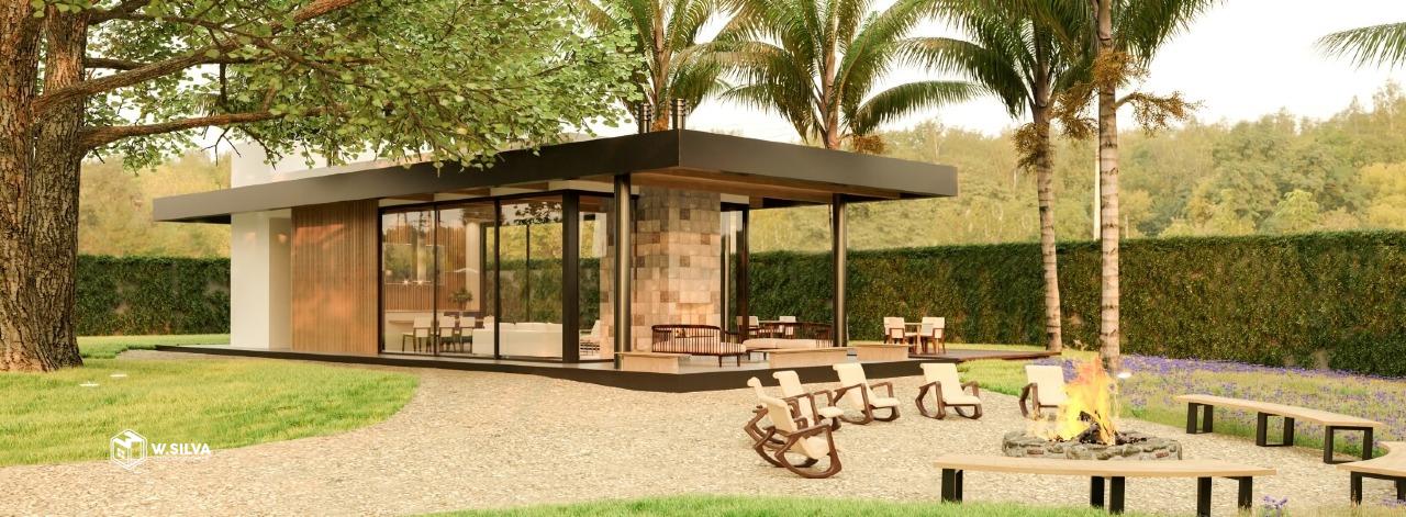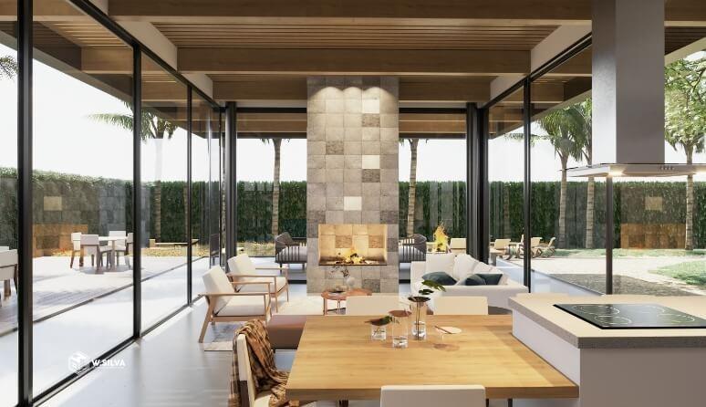 - Espaço Jatobá (salão de festas, espaço gourmet com forno para pizza, lareira dupla face e fogo de chão)