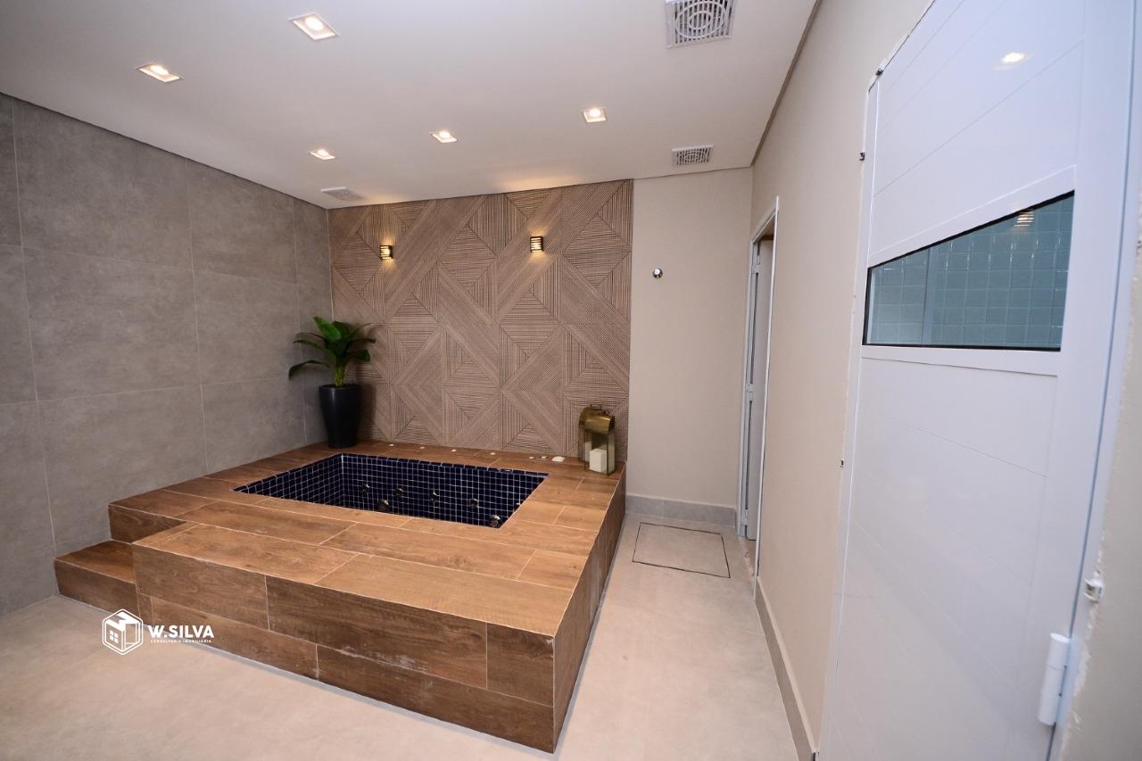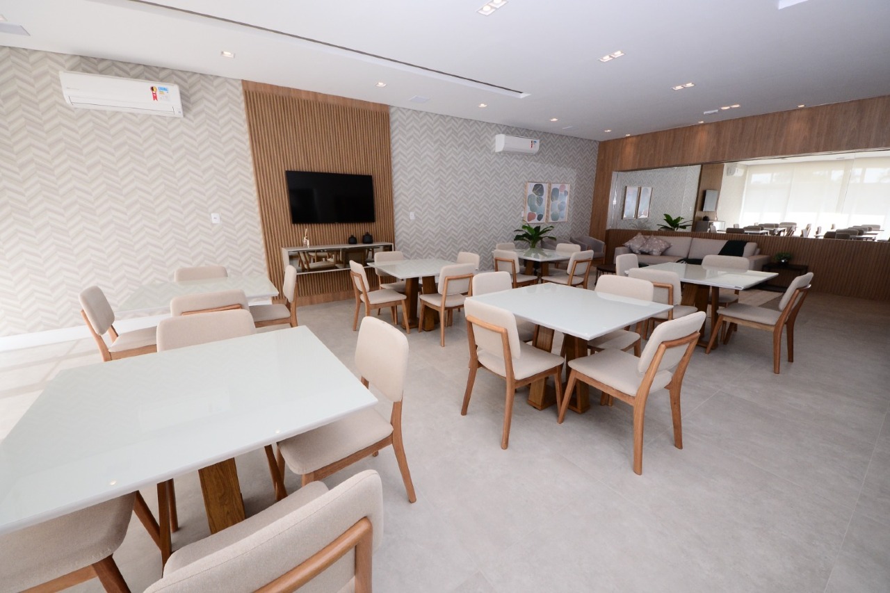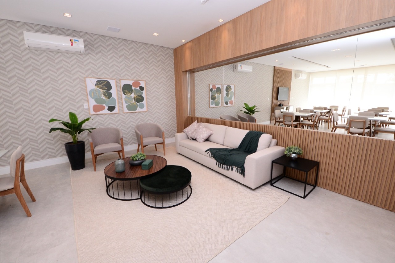 A sala é um charme, com painel de TV e aparador. O dormitório é rico em planejados, com painel de TV e ar-condicionado, garantindo conforto e praticidade. O banheiro possui planejados e box. A cozinha impressiona pela pedra inteiriça e já está equipada com cooktop, forno elétrico e micro-ondas. A área de serviço também tem planejado, mantendo tudo organizado.